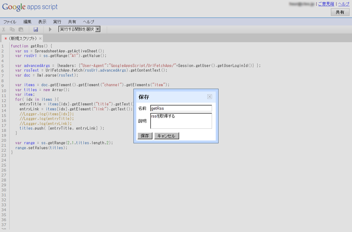 スクリプトの保存+-+Google+Apps+Scriptで超簡易版RSSリーダーを書いてみた