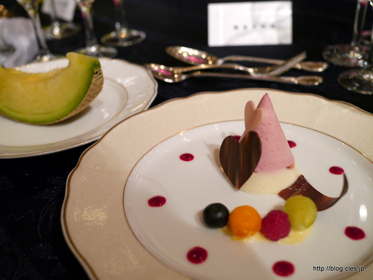 二色のフロマージュブランムース+お祝いのソースで・マスクメロン+-+第一ホテル東京の披露宴メニュー