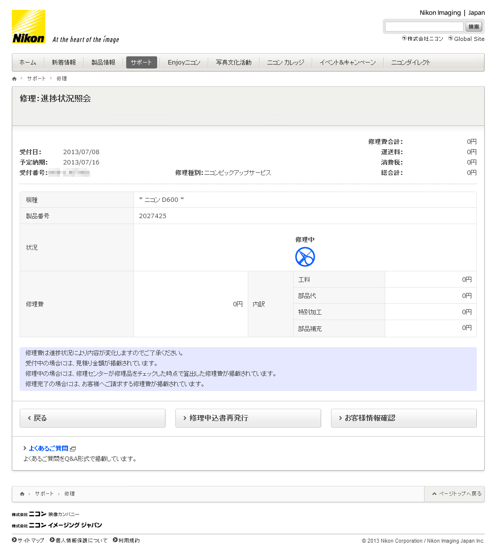 修理進捗状況照会+-+D600+を修理工場入りさせました