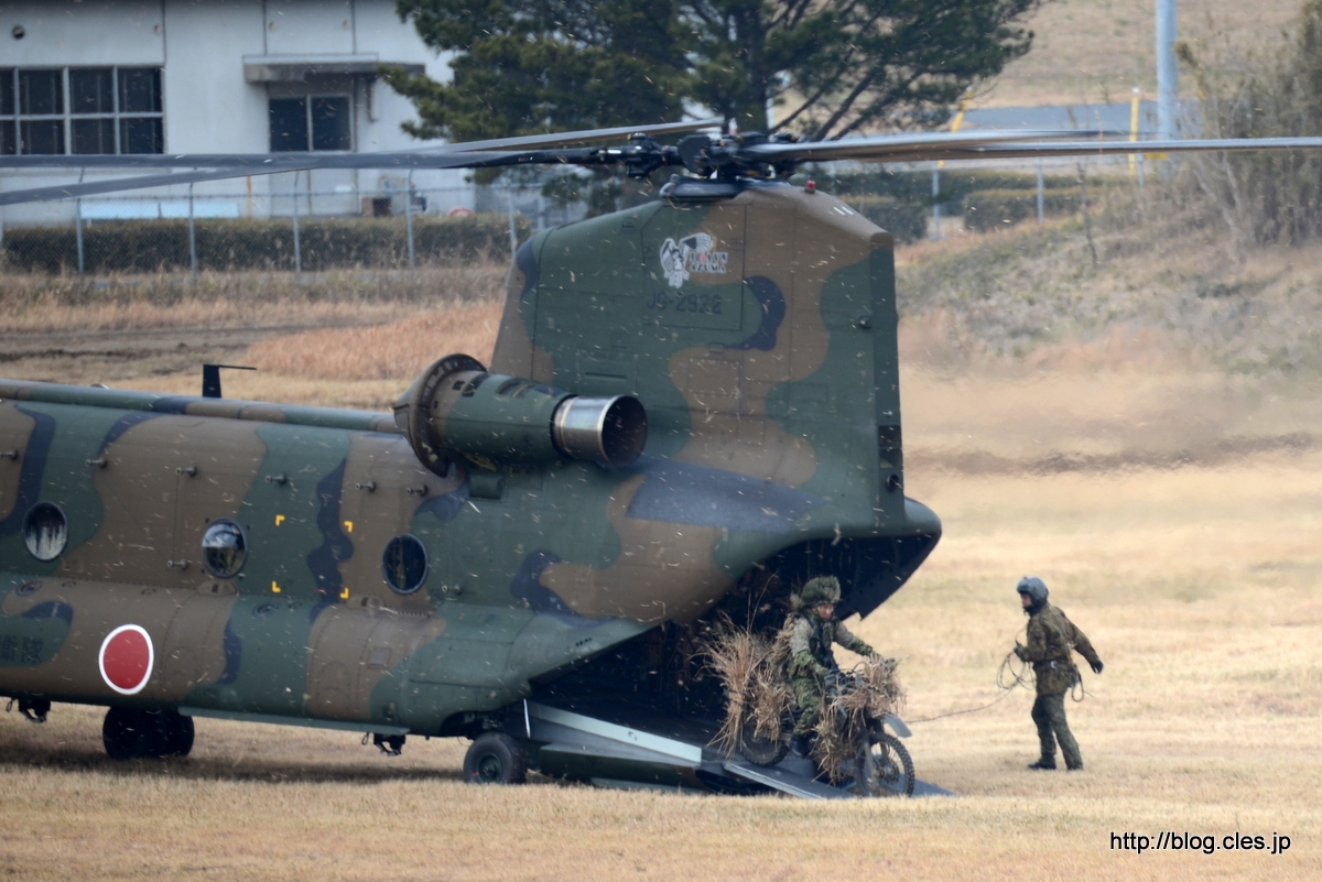 CH-47J(JG-2922)+チヌークからの偵察用オートバイ発進+-+2014年+第1空挺団降下訓練始めで、望遠レンズ初め!