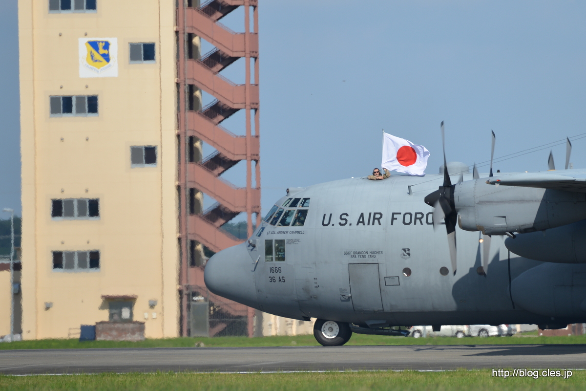 日章旗を掲げる+C-130+Hercules+(AF74-1666)+-+横田基地日米友好祭+2015+のパラシュート降下