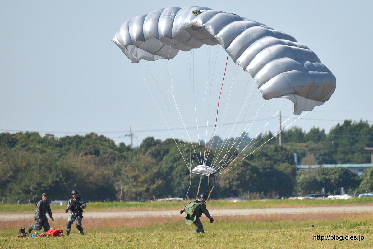 パラグライダーで地面に着地+-+梅組最後の百里基地航空祭+2015(捜索救難展示編)