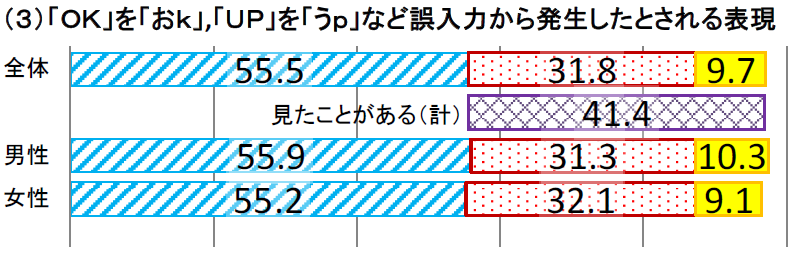 (3)「OK」を「おけ」や「おk」,「UP」を「うp」など,誤入力から発生したとされる表現+-+「おk」とか「うp」とか見たことある?