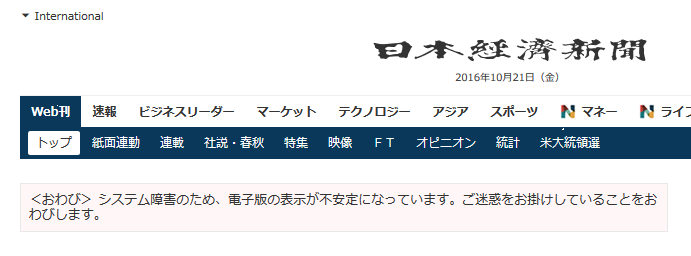 トップ部分のお詫び+-+日経でシステム障害?