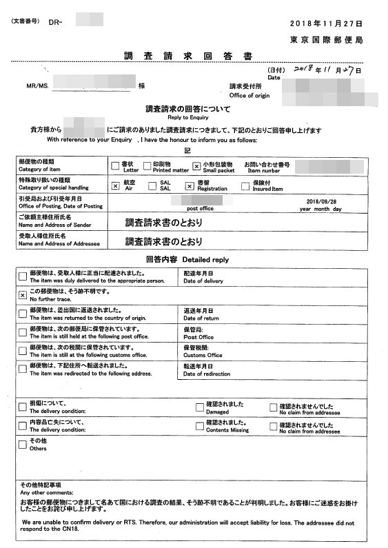 調査請求の回答書+-+この郵便物は、そう跡不明です。(No+further+trace.)
