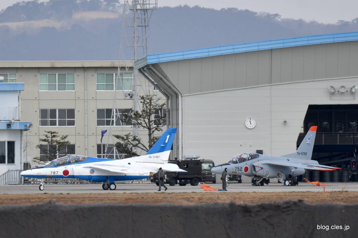 滑走路に向かう1番機(06-5787)、T-4(76-5752)+-+聖火到着式とブルーインパルスのカラースモーク